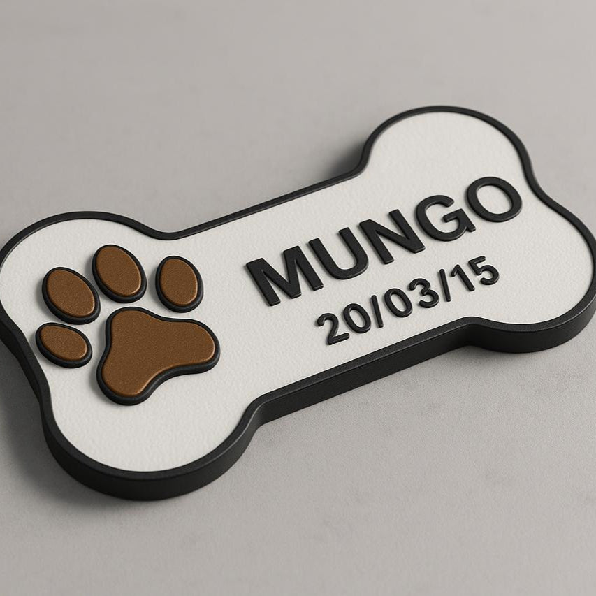 This adorable bone-shaped keepsake is 3D printed in a soft white finish, featuring a raised brown paw print on one side and your pet’s name and special date in bold black text. A gentle black rim frames the design, adding a sleek and heartfelt touch.